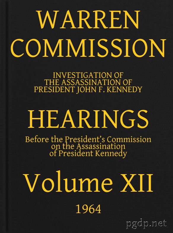 The Project Gutenberg EBook of Warren Commission (12 of 26): Hearings Vol. XII (of 15), by The President's Commission on the Assassination of President Kennedy This eBook is for the use of anyone anywhere at no cost and with almost no restrictions whatsoever. You may copy it, give it away or re-use it under the terms of the Project Gutenberg License included with this eBook or online at www.gutenberg.org Title: Warren Commission (12 of 26): Hearings Vol. XII (of 15) Author: The President's Commission on the Assassination of President Kennedy Release Date: October 21, 2013 [EBook #44012] Language: English Character set encoding: ISO-8859-1 *** START OF THIS PROJECT GUTENBERG EBOOK WARREN COMMISSION - HEARINGS V12 *** Produced by Curtis Weyant, Charlene Taylor, Charlie Howard, and the Online Distributed Proofreading Team at http://www.pgdp.net. Images generously provided by www.history-matters.com.