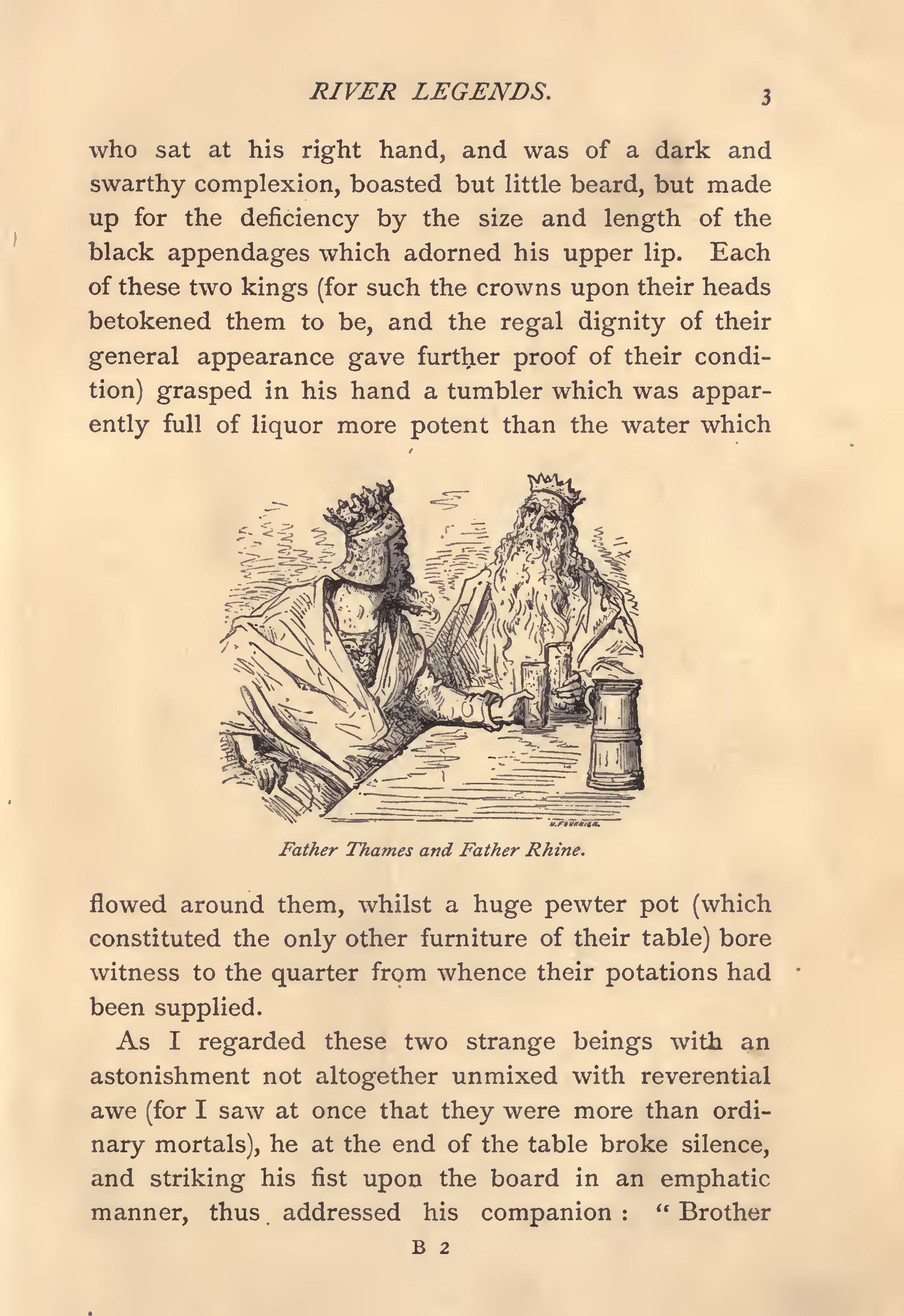 Nearly opposite the spot upon which I had seated myself was a little island in the very middle of the river, dividing the water which flowed on each side of it and left it high and dry. This island was of no great size, and, I should imagine, of no great value either, being covered with reeds and willows, and apparently fit for nothing except to afford shelter to moor-hens and water-rats, which creatures probably found it an exceedingly convenient habitation. Upon the present occasion, however, beings of a different nature altogether appeared to have taken possession of the island. At a plain deal table were seated two ancient individuals of kingly and majestic mien. He who sat at the end of the table wore a white beard of mighty size, which streamed downward to his waist; whilst his companion, who 003sat at his right hand, and was of a dark and swarthy complexion, boasted but little beard, but made up for the deficiency by the size and length of the black appendages which adorned his upper lip. Each of these two kings (for such the crowns upon their heads betokened them to be, and the regal dignity of their general appearance gave further proof of their condition) grasped in his hand a tumbler which was apparently full of liquor more potent than the water which flowed around them, whilst a huge pewter pot (which constituted the only other furniture of their table) bore witness to the quarter from whence their potations had been supplied.