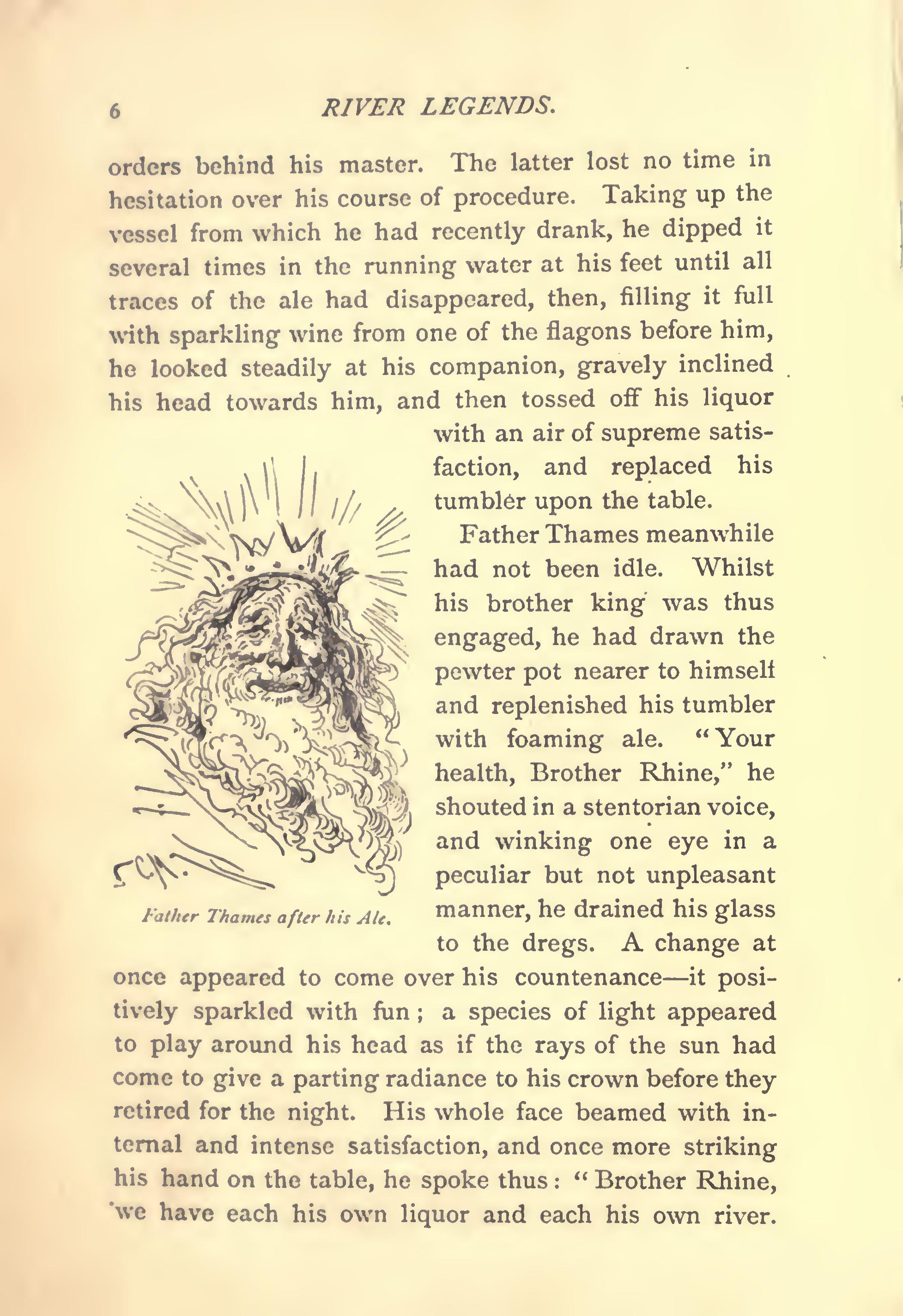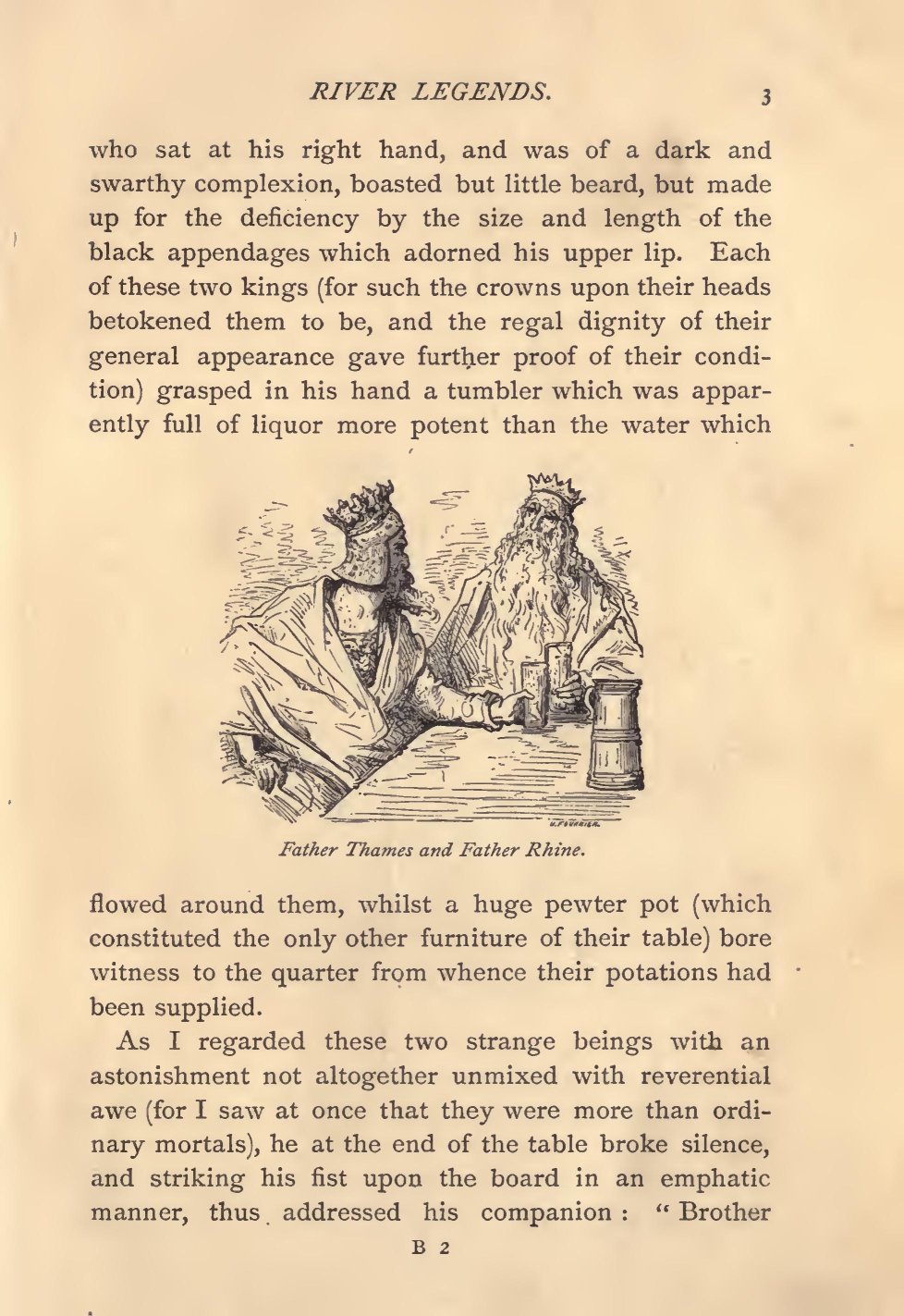 Father Thames meanwhile had not been idle. Whilst his brother king was thus engaged, he had drawn the pewter pot nearer to himself and replenished his tumbler with foaming ale. “Your health, Brother Rhine,” he shouted in a stentorian voice, and winking one eye in a peculiar but not unpleasant manner, he drained his glass to the dregs. A change at once appeared to come over his countenance—it positively sparkled with fun; a species of light appeared to play around his head as if the rays of the sun had come to give a parting radiance to his crown before they retired for the night. His whole face beamed with internal and intense satisfaction, and once more striking his hand on the table, he spoke thus: “Brother Rhine, we have each his own liquor and each his own river. Let 007each enjoy his own! Live and let live. But whilst we sit here so happily, let us while away the time by recounting some of the legends for which our banks are so famous, and of which we each have a good store.”