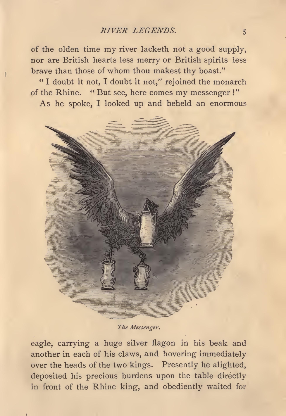 “I doubt it not, I doubt it not,” rejoined the monarch of the Rhine. “But see, here comes my messenger!” As he spoke, I looked up and beheld an enormous eagle, carrying a huge silver flagon in his beak and another in each of his claws, and hovering immediately over the heads of the two kings. Presently he alighted, deposited his precious burdens upon the table directly in front of the Rhine king, and obediently waited for orders 006behind his master. The latter lost no time in hesitation over his course of procedure. Taking up the vessel from which he had recently drank, he dipped it several times in the running water at his feet until all traces of the ale had disappeared, then, filling it full with sparkling wine from one of the flagons before him, he looked steadily at his companion, gravely inclined his head towards him, and then tossed off his liquor with an air of supreme satisfaction, and replaced his tumbler upon the table.