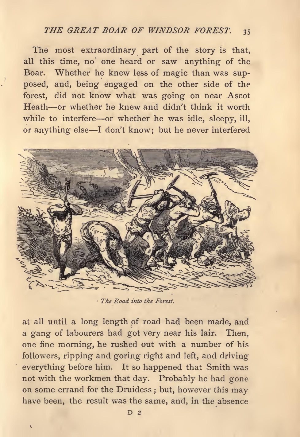 The 035most extraordinary part of the story is that, all this time, no one heard or saw anything of the Boar. Whether he knew less of magic than was supposed, and, being engaged on the other side of the forest, did not know what was going on near Ascot Heath—or whether he knew and didn’t think it worth while to interfere—or whether he was idle, sleepy, ill, or anything else—I don’t know; but he never interfered at all until a long length of road had been made, and a gang of labourers had got very near his lair.