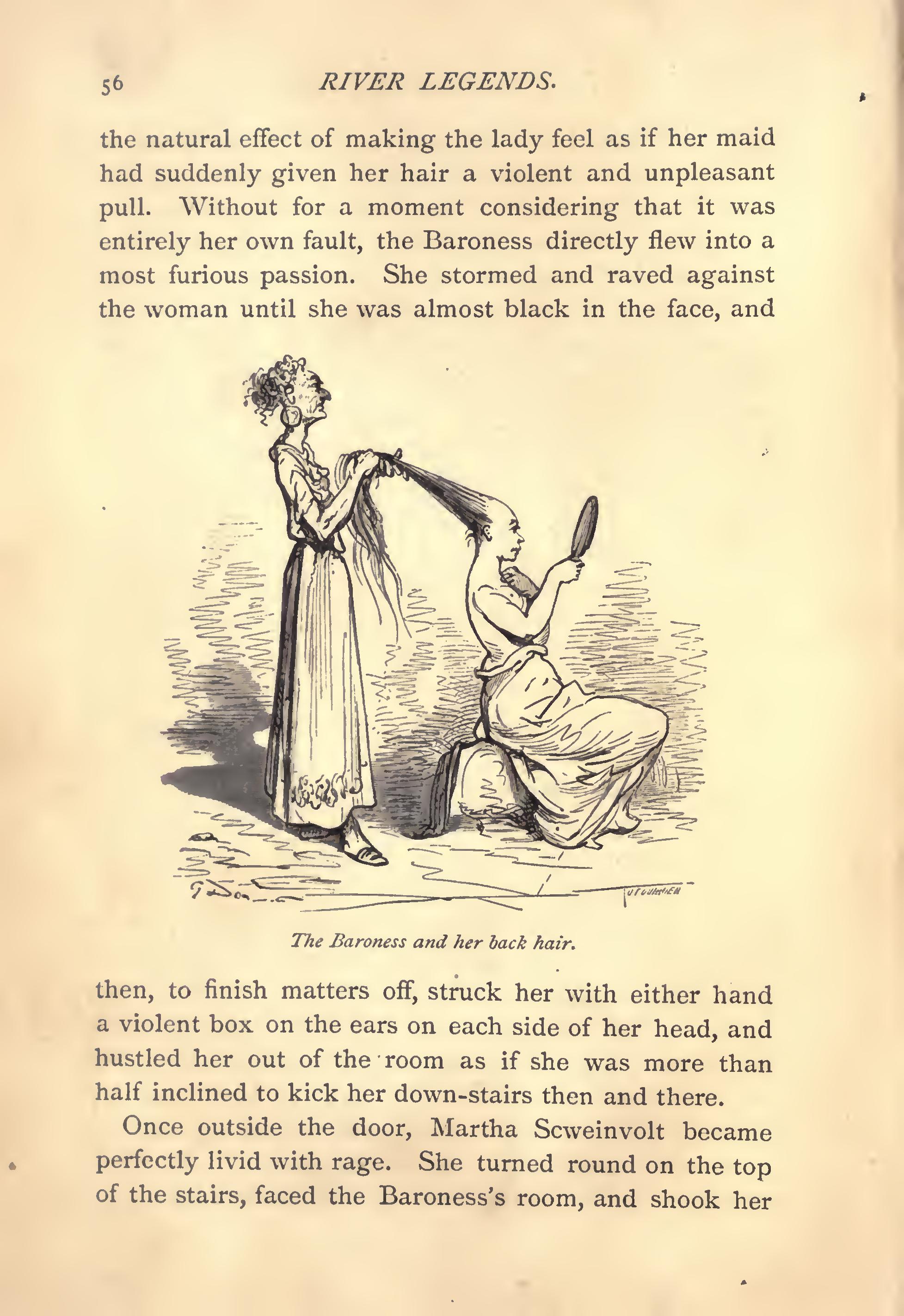 One day it chanced, indeed, that the kettle, so to speak, boiled over. Martha Scweinvolt had been engaged upon her mistress’s back hair, and the latter, seated in “demi-toilette” upon a low stool, had been reading a novel. Suddenly she took it into her head to drop the book and take up a small hand looking-glass to see how her maid was getting on. In so doing she made a forward movement, which, as Martha happened at that instant to have the hair tight in hand, had the 056natural effect of making the lady feel as if her maid had suddenly given her hair a violent and unpleasant pull. Without for a moment considering that it was entirely her own fault, the Baroness directly flew into a most furious passion. She stormed and raved against the woman until she was almost black in the face, and then, to finish matters off, struck her with either hand a violent box on the ears on each side of her head, and hustled her out of the room as if she was more than half inclined to kick her down-stairs then and there.
