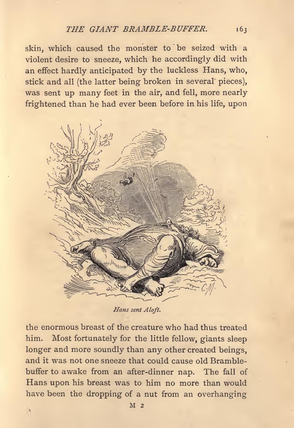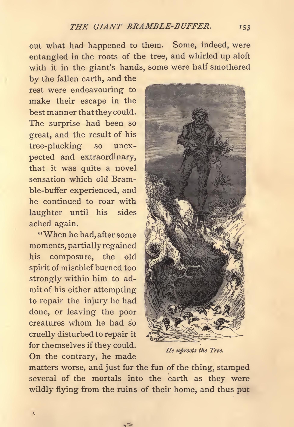 Goody 224Tickleback’s exit from the scene was of a more marked and singular character. It would have been difficult to have disposed of so gigantic a monster by any ordinary process. It could not have travelled by land to the ocean, except on wheels; and although it might have been possible to have paid expenses by sending it thither in the caravan of a travelling showman—supposing a vehicle of that description, and of sufficiently large size, to have been in being—such a course would have been scarcely consistent with the usage of fairyland, or with the nature and circumstances of the case. It might, of course, have been possible to have floated the creature down the waters of my river, but against such a proceeding my nymphs, elves, and swans would have protested indignantly, even had I been disposed for a moment to sanction it. Besides this, the inconvenience to traffic, and the bad odour which so foul a reptile would leave in the water, not to mention its possible indulgence in some mischievous and destructive habits which would have brought the river into bad repute, were all difficulties in the way. I could not allow a “Thames nuisance” to be thus originated which would have been probably fraught with most unpleasant consequences, and could have done no possible good to anybody. This, therefore, being out of the question, it only remained for the owl-fairy to exercise his magic power somewhat further, and get rid of the vast and cumbrous body which he had seen fit to create. The wonderful being made not the slightest difficulty. Waving his rod three times above his head, and describing with it a circle in the air, he struck upon the ground, which immediately opened wide beneath the hideous 225serpent, and exhibited an enormous chasm, down which it slowly disappeared, and was seen no more in those regions of the earth.