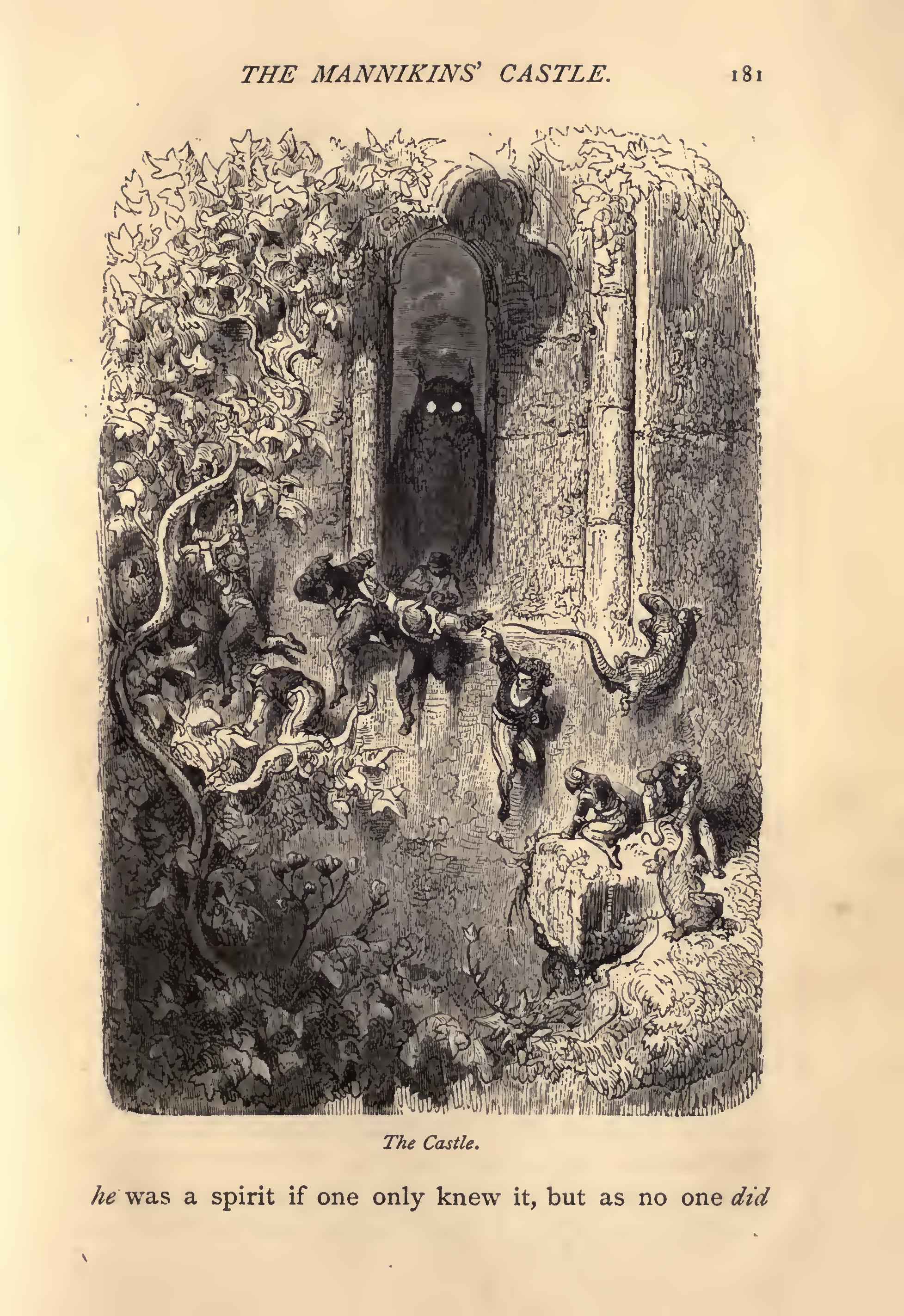 Scarcely had the bats On one side, and the cats on the other, passed the castle walls, when a voice, the loud and clear accents of which were distinctly heard above the cries of the assaulting party, exclaimed, “Light the gas!” and in another moment a blaze of light illuminated the whole place with a brightness beyond that of the sun’s own rays. Every corner and crevice was lighted up with wondrous brilliancy, and no concealment was any longer possible for any mortal being. Then, in every niche of the old walls, upon the old staircases, at the windows, and on the crumbling ledges around, a quantity of armed mannikins were seen standing ready for action, whilst one window alone remained unlit and mysteriously dark, and there were those present who knew at that moment, if they had never known before, that the owl who sat in that window was a mighty magician, 199 and that a Power unseen and unfelt as yet, but too terrible for evil witches and their followers, dwelt within those old walls.