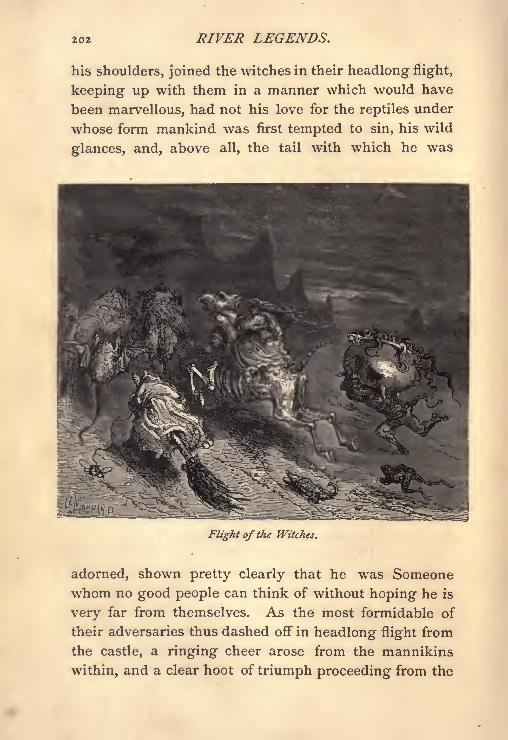The results which I have just described occupied barely ten minutes, and within a quarter of an hour the three witches, with their attendant bats, cats, hooded crows, and other animals who had constituted the reserve, were in full flight from the castle. A certain number of the snakes also made their escape in a curious manner. A strange-looking being, in the shape of a man, with a huge vessel before him, had mysteriously appeared near the castle wall just as the assault began, and as soon as it was plain that the day was going against the attacking party, he gathered up as many of the snakes as he could from their painful position on and about the walls, filled the aforesaid vessel with them (handling them all the while with the greatest tenderness), and throwing it on his 202shoulders, joined the witches in their headlong flight, keeping up with them in a manner which would have been marvellous, had not his love for the reptiles under whose form mankind was first tempted to sin, his wild glances, and, above all, the tail with which he was adorned, shown pretty clearly that he was Someone whom no good people can think of without hoping he is very far from themselves.