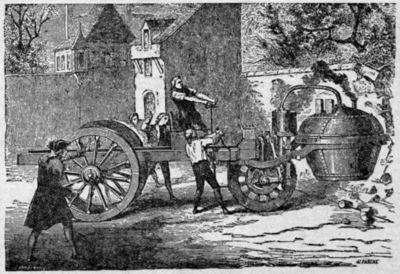 The boiler was fastened on the front of the car, which moved on three wheels—the steam acted only on the foremost wheel.