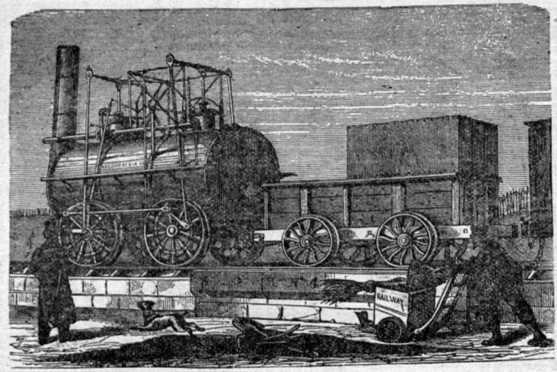 The first practical locomotive in the world—Stephenson's invention, was Old No. 1, which pulled the first regular train on the Stockton and Darlington R. R. on Tuesday, September 27, 1825.