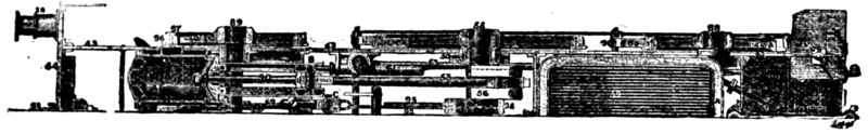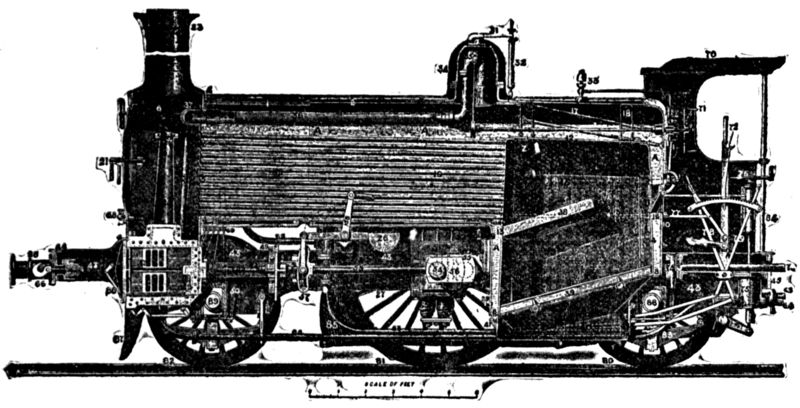 1, 2, 3, Rings arranged telescopically, forming barrel of boiler. 4, Solid angle-iron ring. 5, Tube plate. 6, Smoke box. 7, Shell, or covering plate. 8, Foundation ring. 9, Throat plate. 10, Back plate. 11, Fire door. 12, Covering plate of inside fire-box. 13, Tube plate. 14, Back plate. 15, Stays. 16, Mouth-piece. 17, Stays from inside fire-box to shell plate. 18, Palm stays. 19, Tubes. 20, Smoke-box door. 21, Pinching screw. 22, Chimney. 23, Chimney cap. 24, Blast pipe. 25, Top of blast pipe. 26, Balance weight. 27, Wheel spokes. 28, Front buffer. 29, Mud plug. 30, Safety valve. 31, Safety lever. 32, Spring balance. 33, Whistle. 34, Dome. 35, Regulator. 36, Steam pipes. 37, Elbow pipe. 38, Brick arch. 39, Fire bars. 40, Ash pan. 41, Front damper. 42, Back damper. 43, Frame plate. 44, Iron buffer beam (front). 45, Iron buffer beam (back). 46, (See half width plan) cylinder. 47, Cylinder posts, valve. 48, Valve chest. 49, Steel motion plate. 50, Horn blocks. 51, Axle boxes. 52, Slide bars. 53, Connecting rod. 54, Crank shaft. 55, Crank shaft, big[Pg 14] end of. 56, Crank shaft, arm of. 57, Expansion link. 58, Weigh-bar shaft. 59, Valve spindle. 60, Valve rod guide. (See half width plan). 61, Pump. 62, Delivery pipe. 63, Field pipe. 64, Exhaust pipe. 65, Volute spring. 66, Draw-bar hook. 67, Lamp iron. 68, Oil cup. 69, Oil pipes. 70, Cab. 71, Regulator handle. 72, Reversing lever. 73, Draw-bar. 74, Draw-pin. 75, Steam-brake cylinder. 76, Hand-brake. 77, Sand-rod. 78, Front damper. 79, Back damper. 80, Trailing wheel. 81, Driving wheel. 82, Leading wheel. 83, Spring. 84, Hand rail. 85, Brake blocks. 86, Waste water-cocks. 87, Life guard. 88, Railing axle. 89, Leading axle. Z, Lead plug.