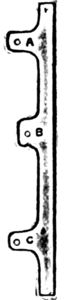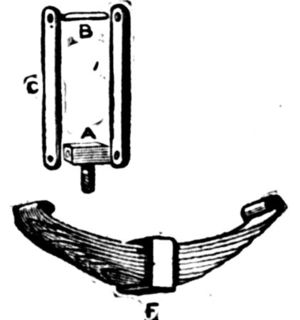 43, Frame plate from end to end of engine. 44, Iron buffer-beam. 46, Cylinders. 50, Horn block, to carry axle-box and brass. 51, Axle-box and brass. 52, Slide bars. 53, Connecting-rod. 54, Driving axle. 55, Big end of driving axle. 56, Arm of driving axle. 59, Valve-spindle. 60, Valve-rod guide. 61, Pump. 76, Hand brake. 85, Brake blocks. 88, Trailing axle. 89, Leading axle. 90, Piston rod. 91, Piston head, held on the rod by a brass nut. 92, Backway eccentric rod. 93, Frontway eccentric rod. 94, Eccentric Straps. 95, Eccentric sheaves. 96, Tire. 97, Lip on tire. 98, Brake irons. 99, Foot plating. 100, Transverse stay. A, Water space between inside and outside fire boxes. B, Slide-block with end of pump-ram screwed into the end. C, Link motion (see 57, inside view). D, Slide valve rod, working guide. H, Inside journal, showing how the axle is supported inside of frame plates. I, Cross-head, solid, with piston rod.