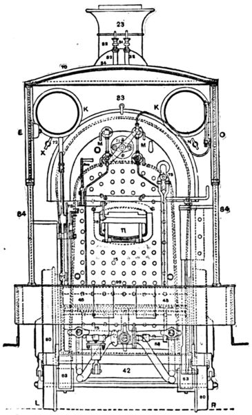 1, 2, 3, Rings arranged telescopically, forming barrel of boiler. 4, Solid angle-iron ring. 5, Tube plate. 6, Smoke box. 7, Shell, or covering plate. 8, Foundation ring. 9, Throat plate. 10, Back plate. 11, Fire door. 12, Covering plate of inside fire-box. 13, Tube plate. 14, Back plate. 15, Stays. 16, Mouth-piece. 17, Stays from inside fire-box to shell plate. 18, Palm stays. 19, Tubes. 20, Smoke-box door. 21, Pinching screw. 22, Chimney. 23, Chimney cap. 24, Blast pipe. 25, Top of blast pipe. 26, Balance weight. 27, Wheel spokes. 28, Front buffer. 29, Mud plug. 30, Safety valve. 31, Safety lever. 32, Spring balance. 33, Whistle. 34, Dome. 35, Regulator. 36, Steam pipes. 37, Elbow pipe. 38, Brick arch. 39, Fire bars. 40, Ash pan. 41, Front damper. 42, Back damper. 43, Frame plate. 44, Iron buffer beam (front). 45, Iron buffer beam (back). 46, (See half width plan) cylinder. 47, Cylinder posts, valve. 48, Valve chest. 49, Steel motion plate. 50, Horn blocks. 51, Axle boxes. 52, Slide bars. 53, Connecting rod. 54, Crank shaft. 55, Crank shaft, big[Pg 14] end of. 56, Crank shaft, arm of. 57, Expansion link. 58, Weigh-bar shaft. 59, Valve spindle. 60, Valve rod guide. (See half width plan). 61, Pump. 62, Delivery pipe. 63, Field pipe. 64, Exhaust pipe. 65, Volute spring. 66, Draw-bar hook. 67, Lamp iron. 68, Oil cup. 69, Oil pipes. 70, Cab. 71, Regulator handle. 72, Reversing lever. 73, Draw-bar. 74, Draw-pin. 75, Steam-brake cylinder. 76, Hand-brake. 77, Sand-rod. 78, Front damper. 79, Back damper. 80, Trailing wheel. 81, Driving wheel. 82, Leading wheel. 83, Spring. 84, Hand rail. 85, Brake blocks. 86, Waste water-cocks. 87, Life guard. 88, Railing axle. 89, Leading axle. Z, Lead plug.