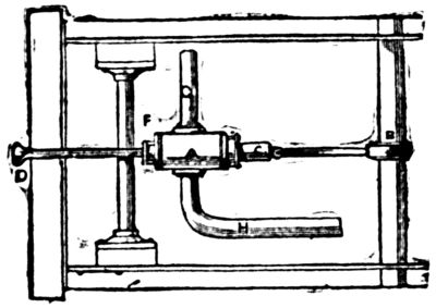 43, Frame plate from end to end of engine. 44, Iron buffer-beam. 46, Cylinders. 50, Horn block, to carry axle-box and brass. 51, Axle-box and brass. 52, Slide bars. 53, Connecting-rod. 54, Driving axle. 55, Big end of driving axle. 56, Arm of driving axle. 59, Valve-spindle. 60, Valve-rod guide. 61, Pump. 76, Hand brake. 85, Brake blocks. 88, Trailing axle. 89, Leading axle. 90, Piston rod. 91, Piston head, held on the rod by a brass nut. 92, Backway eccentric rod. 93, Frontway eccentric rod. 94, Eccentric Straps. 95, Eccentric sheaves. 96, Tire. 97, Lip on tire. 98, Brake irons. 99, Foot plating. 100, Transverse stay. A, Water space between inside and outside fire boxes. B, Slide-block with end of pump-ram screwed into the end. C, Link motion (see 57, inside view). D, Slide valve rod, working guide. H, Inside journal, showing how the axle is supported inside of frame plates. I, Cross-head, solid, with piston rod.