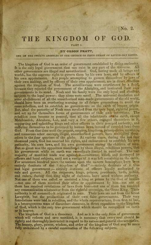 The kingdom of God is an order of government established by divine authority. It is the only legal government that can exist in any part of the universe. All other governments are illegal and unauthorized. God, having made all beings and worlds, has the supreme right to govern them by his own laws, and by officers of his own appointment. Any people attempting to govern themselves by laws of their own making, and by officers of their own appointment, are in direct rebellion against the kingdom of God. The antediluvians were overthrown by a flood, because they rejected the government of the Almighty, and instituted their own governments in its stead. Noah and his family were the only loyal and obedient subjects to the legal power: they alone were saved. The universal desolation and utter abolishment of all the unauthorized man-made governments of the old world, should have been an everlasting warning to all future generations to avoid the same rebellion, and to establish no governments on the earth of human origin. But, alas! the posterity of Noah soon revolted from the only legal, rightful power, and set up for themselves forms of governments of their own inventions. The rebellion soon became so general, that all the inhabitants of the earth, except Melchizedek, Abraham, Lot, and a very few others, engaged themselves in it, supporting and upholding kings and other officers in their usurped authority, and suffering themselves to be governed by human laws, instead of revealed laws from God. From that time until the present, empires, kingdoms, principalities, republics, and numerous other corrupt, illegal, unauthorized powers, have multiplied themselves in the four quarters of the globe. At various times, during the last four thousand years, God has asserted his rights, and endeavoured to establish his own authority, his own laws, and his own government among the children of men. But so great was the opposition manifested by those illegal, rebellious powers, that his government while on earth was exceedingly limited in numbers. The vast majority of mankind made war against it—overcame, killed, and destroyed its officers and loyal subjects, until not a vestige of it was left remaining on the earth. For seventeen hundred years the nations upon the eastern hemisphere have been entirely destitute of the "kingdom of God"—entirely destitute of a true and legal government—entirely destitute of officers legally authorized to rule and govern. All the emperors, kings, princes, presidents, lords, nobles, and rulers, during that long night of darkness, have acted without authority. Not one of them was called or anointed a king or a prince by the God of heaven—not one of them received his office or appointment by him—not one of them has received revelations or laws from him—not one of them has received any communication whatsoever from the rightful sovereign, the Great King. Their authority is all assumed—it originated in man. Their laws are not from the Great Lawgiver, but the productions of their own false governments. Their very foundations were laid in rebellion, and the whole superstructure, from first to last, is a heterogeneous mass of discordant elements, in direct opposition to the kingdom of God, which is the only true government which should be recognized on earth or in heaven.
