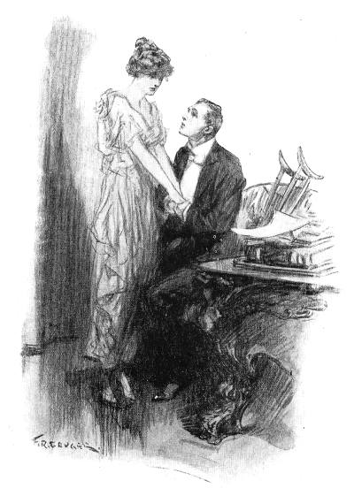 On the hearthrug in front of the fireplace stood a girl. She was a young girl. In age she was nineteen perhaps, or it may have been a little more. But whatever her age, or whether you would or would not call her beautiful, there was one thing about her that was not to be mistaken. It was the allurement of her smile, a merriment that danced and rippled in her eyes like the sheen on sunlit silk. At the moment it happened that a young man in[7] evening clothes stood before her, and with her arms uplifted, her slender form close to his, the girl was intently tying his necktie. All her attention was centered on the task as with deft fingers she molded the white lawn into a bow; but with the young man it was different. His face, so far from wearing the vacuous, bored expression seen on the faces of those who must have their neckties tied, seemed interested to an extreme. With parted lips, his eyes smiling, he was gazing down at the face now so near to his.