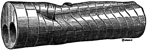 As the flat ends of such boilers are always being sprung by each alternation of pressure into a more or less spherical shape, as shown by the elastic model exhibited, this consideration no doubt led to the ends being made hemispherical, as shown in Pg 21 Fig. 25; and plain cylindrical boilers with these hemispherical ends are now so commonly used that they far outnumber any other form of boiler. Their shape renders them very strong, as the whole of the iron is in simple tension, and internal pressure has no tendency to alter the shape, as is shown by the elastic model exhibited. There is one circumstance very much in favour of the plain cylindrical boilers, and that is that they can be so easily cleaned and repaired, as a man can stand properly at his work at every part and the whole of the interior surface is exposed equally to view. They are of course exposed to all the evils of boilers externally fired, the part under greatest strain being weakened by the action of the fire; and the bottom is also exposed to injury from accumulation of mud and chips of scurf, which cannot be prevented from falling there, and lying upon the part exposed to the direct action of the fire. When made of great length, such as 70 or 80 feet, as is the practice for applying the waste gas from blast furnaces, these boilers are also liable to seam-rips or "broken backs," owing to the greater expansion of the bottom exposed to the fierce flame for its whole length, than of the top which is kept cooler by exposure to the air; and it would therefore be better to have a succession of short boilers, rather than only a single one, where great length is required.