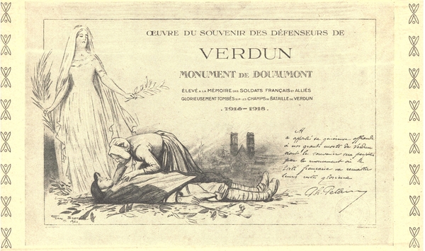 An artistic diploma by Georges Scott is sent to every subscriber of 20 francs, on which there is a reproduction of Marshal Pétain's autograph and an acknowledgement of the subscriber's interest in the memorial (Photo. herewith).