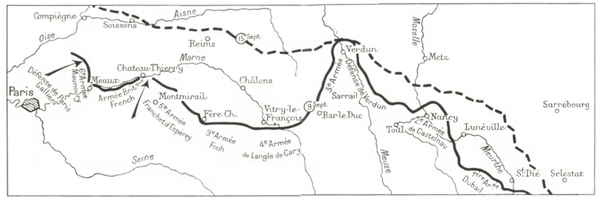 September 11th, 12th, 13th, 14th. Coming from the German right, the advancing wave gradually overtook the armies of the Prince of Wurtemburg and the Crown Prince. The two latter, mad with rage, were forced to withdraw their forces in echelon, while Sarrail's army pivoting round Verdun harassed the enemy as far as Argonne. Thus the battle of the Marne was won by the same troops who had just undergone the repulse of the battle of the Frontiers and, when overwrought with fatigue, had successfully accomplished a retreat unprecedented in history. The undaunted spirit of Commander-in-Chief Joffre, the well-defined and masterful strategy which he planned and carried out in strict collaboration with his highly courageous army commanders, above all the superhuman bravery of the rank and file, to these factors is due what to-day we call "The Miracle of the Marne".