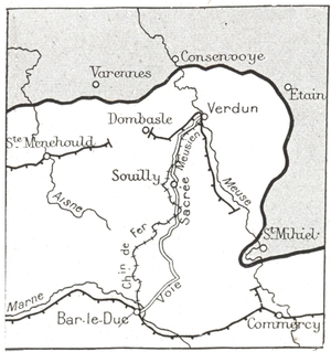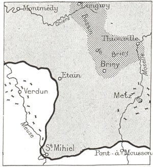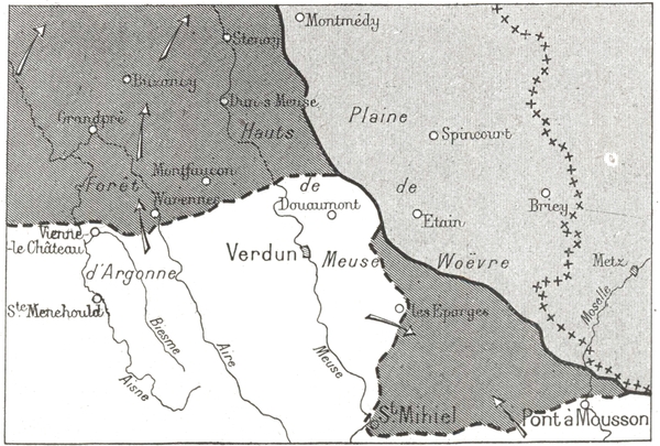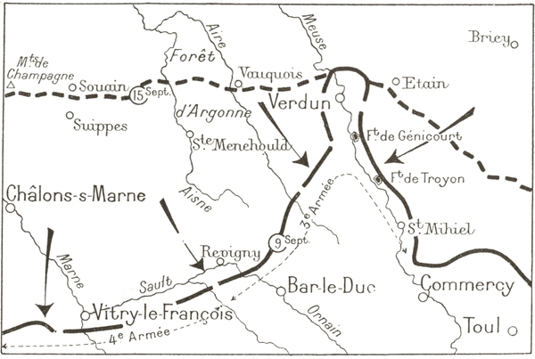 October 1914-August 1915.—The enemy strove to cut off Verdun. On the East, the Salient of Saint-Mihiel. On the West, the battle of Argonne.
