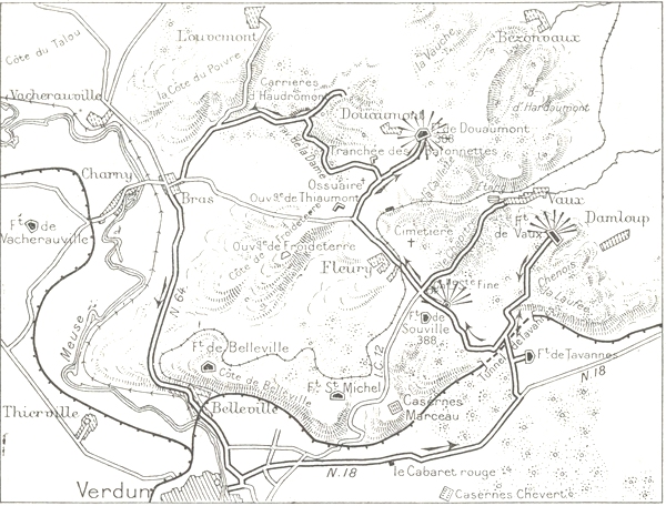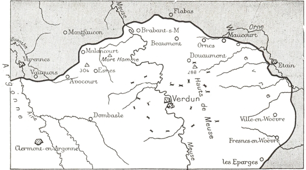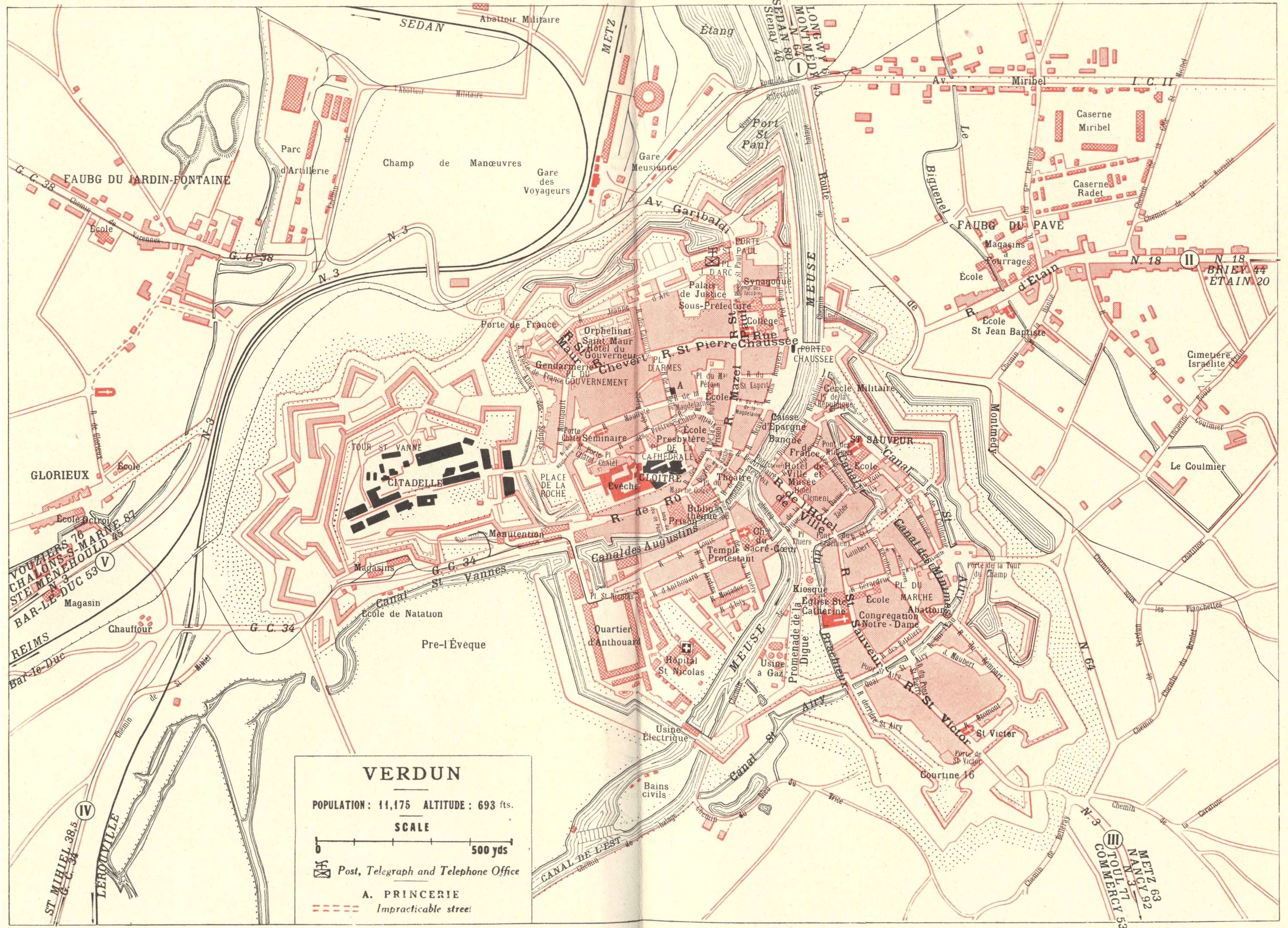 Both in respect of its geographical position and history, Verdun is a typical fortified town. From time immemorial it has played an important part in resisting invasion, as witness its fortified camp and citadel. Since 1870 it has been the centre of a stronghold formed by a rough semi-circle of hills and slopes bristling with defensive works and batteries.