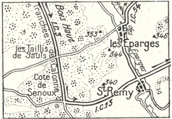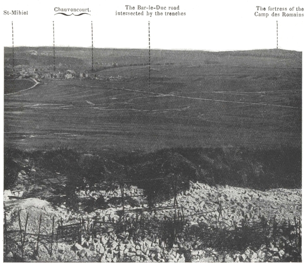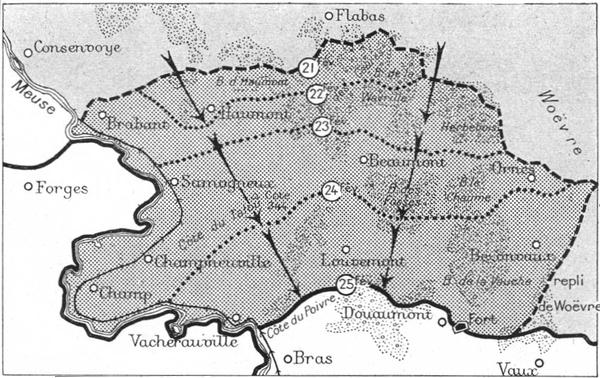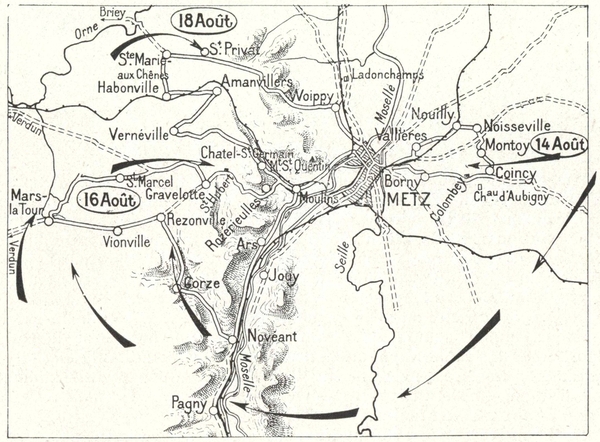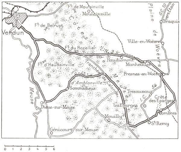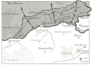 On September 20th, the third Bavarian Corps attacked the 75th reserve division, advanced rapidly on the 22nd as far as the line Combres-Vigneulles-Thiaucourt (p. 9) and bombarded the forts of the Hauts-de-Meuse. This line was defended by mobile troops outnumbered by two to one.