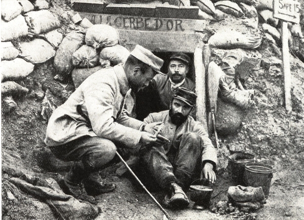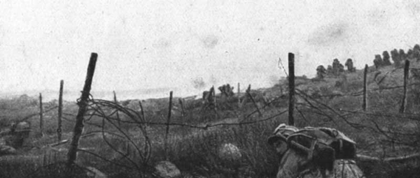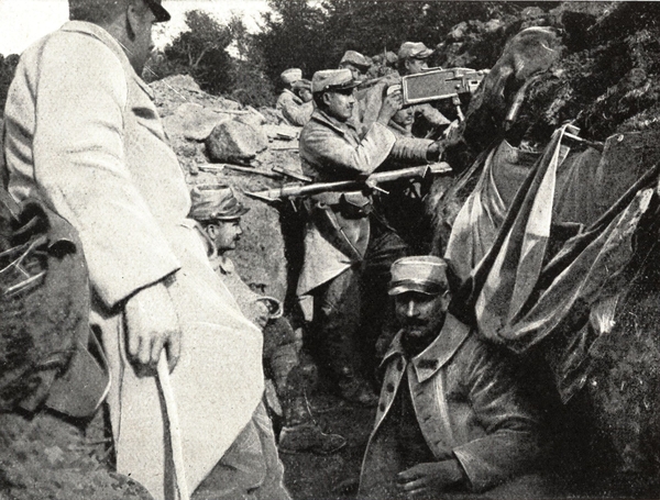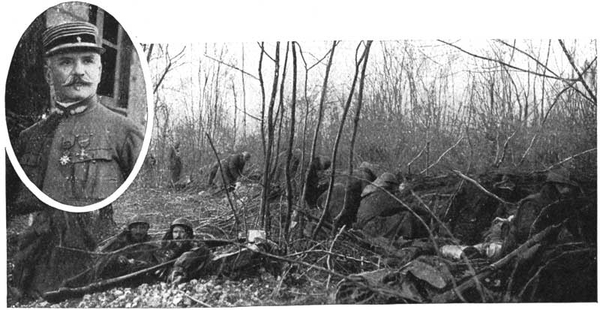 Springs rose everywhere and rivulets ran over the clayey soil. Mud made the paths impassable, and filled up the trenches as soon as they were made. French and German trenches intersected. Firing was continuous, snipers perched here and there in trees taking careful aim, while at night rifle and machine gun fire at random continued uninterruptedly, sweeping the forest in order to prevent surprise and to make movement dangerous. But the rifle was merely an auxiliary weapon, as each army rained showers of grenades and bombs upon the other all day long.