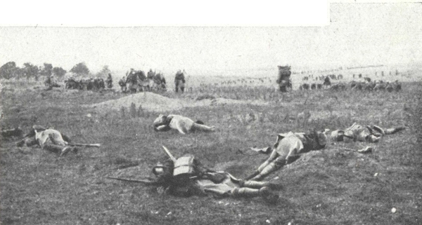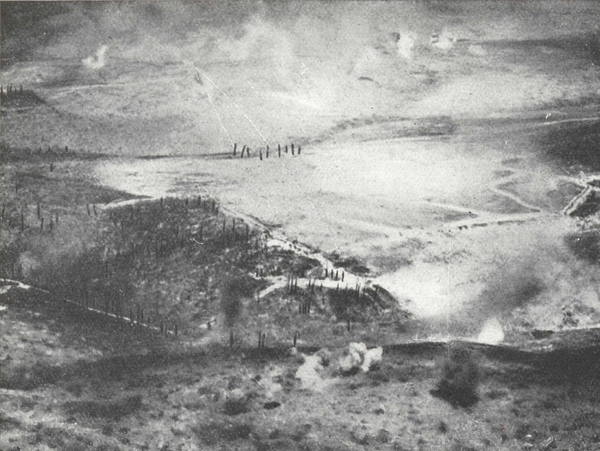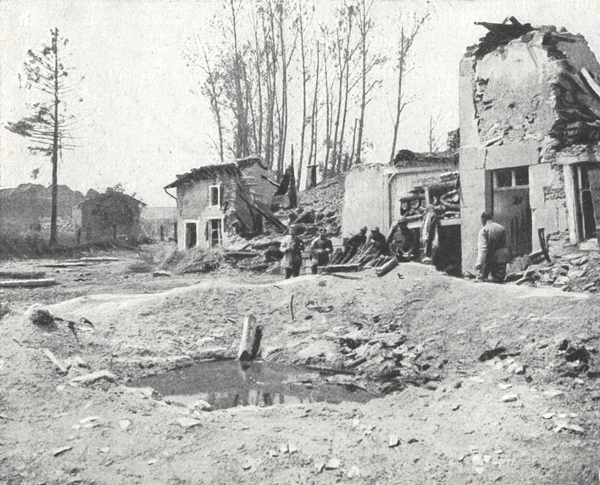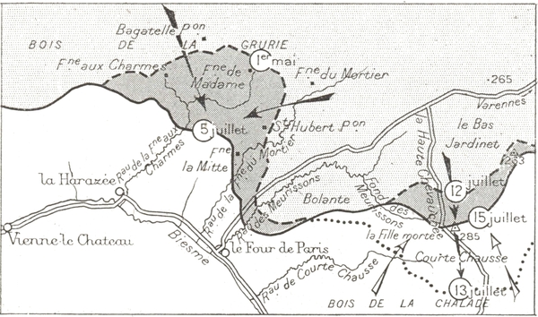 On June 20th in the morning, after a violent bombardment of gas shells, two Prussian and Wurtemburg divisions attacked in the wood of Grurie. The foot-soldiers of the 32nd Corps, though gassed and almost buried in their trenches, put up a fierce resistance. Their positions were subjected to a veritable siege. The enemy, however, captured Fontaine-aux-Charmes.
