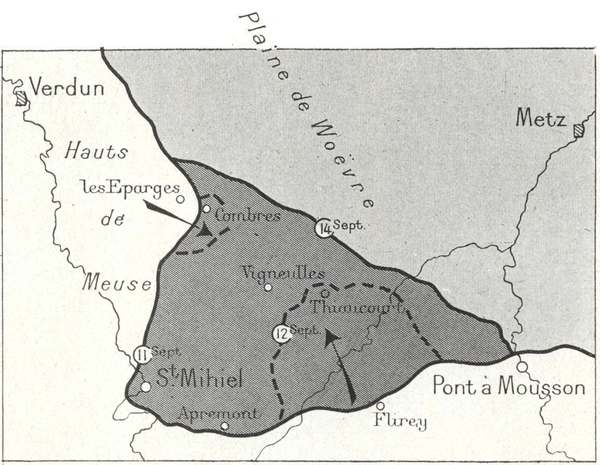 On the 25th, the Germans succeeded in getting a footing on the Hauts-de-Meuse in the region of Vigneulles. From there they pushed on to Saint-Mihiel and entered the town, without however being able to cross the Meuse. But on the following day, the river which was only defended at this point by a battalion of territorials was cleared, and the Germans started to climb again towards the valley of Aire, in the direction of Verdun. At this dangerous moment, the sixteenth corps which had left Nancy met the German forces, harassing them and forcing them to fall back on the suburbs of Saint-Mihiel. It did not, however, succeed in forcing them to withdraw on the right bank of the Meuse. On September 29th the line ran through Combres, Chauvoncourt, Apremont, Flirey, Le Bois le Prêtre.