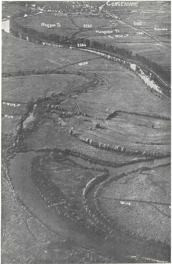 While these obstinate encounters were going on in the forest of Argonne, the 9th and 10th French Divisions (5th Corps) attacked in the valley of the Aire and set out to storm Vauquois, a village perched on a mound commanding all the valley, which the enemy had constituted a defensive centre and a first class observation post.