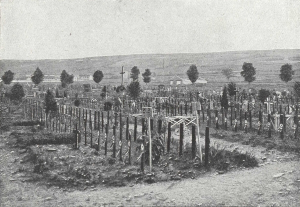 The road runs between the vast slaughterhouse, the cattle market and the huts used as an army storehouse. An old cemetery is crossed with some monumental tombs standing in the midst, and then by skirting the Israelite cemetery and the Moselle the military cemetery is reached.