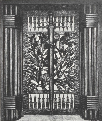William II as the prophet Daniel over the porch erected by the Germans with The board in his hands commemorating his downfall: