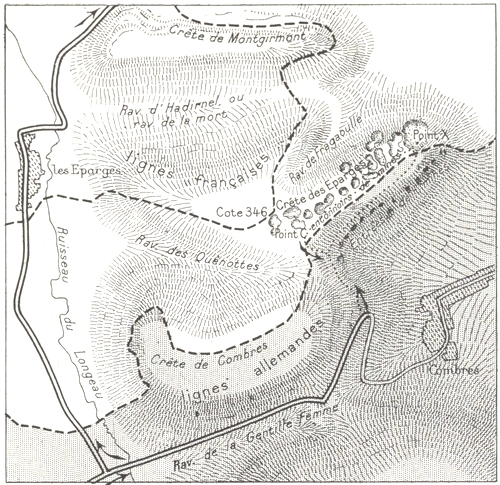 The crest of Les Éparges, after being held firmly by the enemy from September 1914, was strongly attacked on April 6th by the twelfth Infantry Division who struggled obstinately for over a month before they wrested from the Germans the observation posts which from this crest, gave near views towards the North. This brilliant action was followed by counter-attacks by the Fifth German Corps, which were particularly violent during the day-time of April 24th and May 5th. Starting from this moment, the struggle assumed a less stubborn character, but none the less keen and murderous. (See page 129.)
