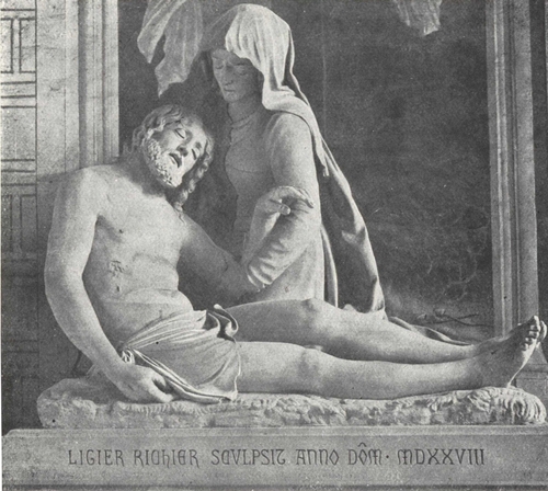 The Doric fore-part of Blondel's design was pulled down in 1903 by the Germans, to make way for a west door conceived in the style of the rest of the church. It was not, however, a very happy effort. At the corners were (p. 178) sculptured statues of the prophets. One of these statues, that of Daniel, had the face of William II. The inhabitants of Metz, who had always resented the presence of this effigy at the entrance to their Cathedral, before the arrival of the French troops, fastened to its hands a chain from which hung a small board bearing the words: Sic transit gloria mundi.