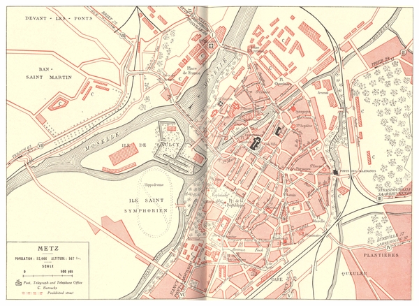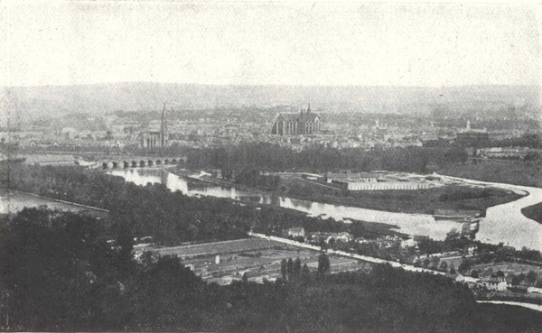 (p. 180) From the top of the Cathedral tower the best general view is obtainable of Metz and the country round. One can realise the importance of its forts round which the Moselle seems to be an immense moat. On the left bank, the hills fall sheer and are a natural defence: on the right, the hills are not so high but are strengthened by a line of forts. Likewise, by seeing them glistening in the distance, a better idea is gained of the many streams which encompass or pass through Metz: the Seille and the stream of Saint-Pierre, the stream of Noisseville, the stream of Châtel-Saint-Germain—the Moselle which the canal doubles and which is itself divided, forming in front of Metz the large island Saint-Symphorien, then, near the dam called Wadrineau, the smaller island of Saulcy. At the foot of old Metz flows yet another branch of the Moselle which divides in two to isolate on an island the Préfecture and the Theatre. Beyond is the large island Chambière, recognisable by its drill ground and its cemeteries.