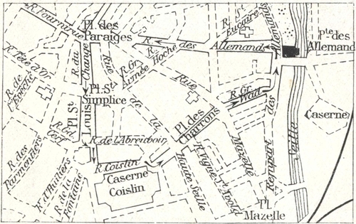 At the far end of the "Place" take the Rue Royale and then turn left into the Rue Coislin which runs alongside the Coislin barracks (plan below).