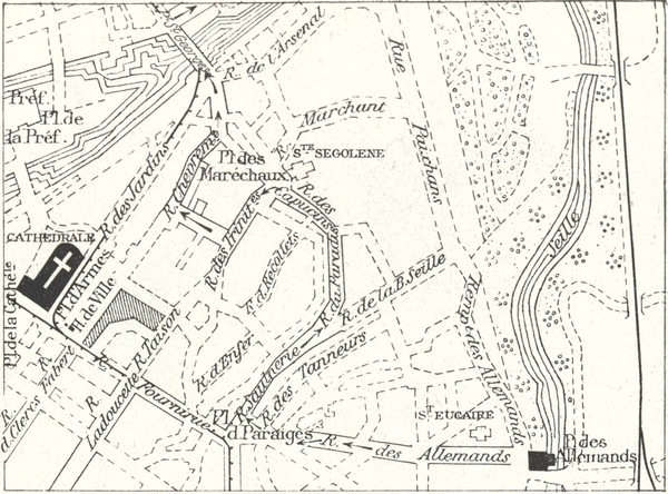 Opposite the Porte des Allemands, take the Rue des Allemands (see the interesting church of Saint-Eucaire on the right) and continue to the Place des Paraiges.