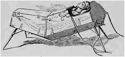 Le travail des mines est un des plus pénibles que l'homme puisse supporter. Être tout le jour dans une nuit profonde, au milieu des infiltrations d'eau, sous l'appréhension des coups de feu, de la chute d'un bloc, d'une inondation; ne pas savoir, en descendant à 500 mètres sous terre, si l'on reverra la lumière du soleil, et la verdure, et les arbres, si l'on embrassera encore sa femme et ses enfants; et tout cela, pour un misérable salaire qui suffit à peine pour soutenir une vie de privations et de sacrifices. Mais si le sort d'un mineur est triste quand il est en bonne santé, il devient épouvantable quand un de ces accidents si fréquents dans les mines fond sur lui, sans qu'aucune puissance humaine puisse ni le prévoir ni l'empêcher; alors, au fond de ces sentiers sinueux, au bout de ces galeries où un homme peut à peine se tenir debout et qui n'ont que la largeur nécessaire au passage d'un chariot, voyez le blessé, une jambe ou un bras cassé, obligé de se traîner péniblement, de faire souvent une demi-lieue dans ces conduits souterrains pour arriver, brisé anéanti, aux abords du puits, c'est-à-dire à 300, 400 ou 500 mètres du sol; voyez-le dans cette ascension pénible, replié sur lui-même dans la benne qui l'enlève, suspendu entre le ciel et la terre, et ayant à peine assez de force pour maudire son sort! Eh bien! cette dernière torture, la plus grande de toutes, celle qui souvent convertit en maladie mortelle une blessure peu importante, le docteur Valat vient de la faire disparaître au moyen d'un lit de sauvetage, de son invention, dont nous donnons le dessin. Cet appareil consiste en une caisse pentagonale légèrement infléchie dans le sens de sa longueur; son couvercle est mobile; elle contient un matelas traversé par une petite sellette et des sangles placées de manière à soutenir le blessé lorsque la caisse doit remonter au jour et prendre une position presque verticale. La caisse porte, de plus, des anses et une espèce de plate-forme où se place le mineur qui doit présider à la remonte. Le déploiement de quatre bras à charnières change la caisse en brancard. Cet appareil a été expérimenté déjà dans quelques houillères, et d'une manière à ne laisser aucun doute sur son efficacité.