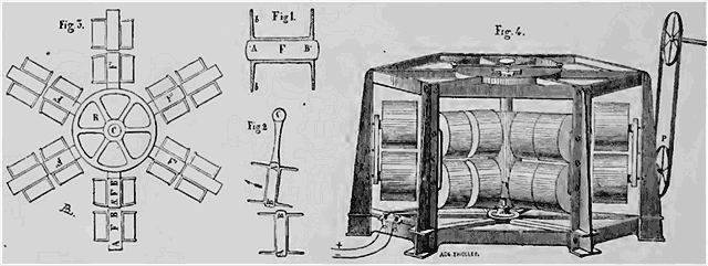 Il y a dans la nature, autour de nous, partout en un mot, des forces considérables cachées, inconnues ou inactives, soit parce qu'on ne sait pas les emmagasiner, soit parce qu'on ignore leur mode d'action. Déjà on se sert de l'eau et de l'air, forces naturelles par excellence et qui agissent directement et sans transformation. La vapeur, force dont l'emploi est si répandu aujourd'hui, est venue ensuite apporter son tribut à l'industrie humaine. Mais il est une force qui se trouve à profusion dans toute la nature, une force qui affecte toutes choses, dont on sait, dont on connaît l'existence, mais qui n'a été jusqu'à présent que l'objet d'expériences de cabinet, sans que personne soit parvenu à la rendre usuelle et pratique, à l'emmagasiner, à lui faire produire en grand un effet utile. M. Froment, ancien élève de l'École Polytechnique, vient de tourner avec succès ses investigations de ce côté, et quoiqu'il n'ait exposé qu'un moteur électrique d'une petite échelle, les résultats qu'il en a obtenus sont assez remarquables et appréciables pour nous faire espérer que le moteur nouveau rendra de grands services à l'industrie. Qu'on nous permette de faire comprendre en peu de mots à nos lecteurs cet ingénieux mécanisme. Lorsqu'un courant électrique traversant un fil mécanique passe près d'un morceau de fer, il y fait naître deux pôles magnétiques, l'un austral, l'autre boréal, semblables à ceux des aimants. Si le fil, au lieu de passer près du morceau de fer, l'entoure un grand nombre de fois dans le même sens, l'effet se trouve multiplié dans une proportion considérable, pourvu que les spires du fil soient isolées les unes des autres, ce qu'on obtient en se servant d'un fil de cuivre couvert de soie. M. Froment s'est servi d'une bobine bb (fig. 1) sur laquelle il a roulé un fil assez long pour faire plusieurs centaines de tours; au centre est un morceau de fer cylindrique F. Le courant électrique y fait naître deux pôles A et B; mais si le sens du courant vient à changer, les pôles changent aussi. Maintenant supposons deux aimants, dont l'un AD (fig. 2) soit solidement fixé sur un support, et l'autre A'B' fasse partie d'une roue dont l'axe est C, et puisse dans son mouvement de rotation passer très-près du fer fixe AB, quand le courant agira simultanément et de manière à faire naître dans l'un un pôle austral qui soit tourné vers le pôle boréal de l'autre, ils s'attireront avec force et la roue mobile tournera; mais elle s'arrêterait après quelques oscillations, si le sens des courants étant subitement changé ne faisait naître un pôle boréal là où était le pôle austral, et par suite une répulsion au lieu d'une attraction. Ce changement de courant s'obtient an moyen d'un anneau métallique fendu à sa circonférence autant de fois que le courant doit changer de sens dans une révolution de la machine. La fig. 3 représente un certain nombre de fers semblables à ceux que nous venons de décrire. De plus, pour utiliser le magnétisme accumulé dans les pôles qui ne sont pas en regard, un second système tout à fait semblable a été superposé au premier, et l'on a réuni les pôles de ces deux étages par des armatures de fer doux. La machine (fig. 4) a pour base un châssis en fonte de fer de forme hexagonale, aux angles duquel s'élèvent six pilastres qui supportent un autre châssis, et c'est dans cette espèce de cage que se trouve le mécanisme. L'auteur n'a pas pu encore mesurer d'une manière précise quelle force elle donne pour une dépense déterminée, mais avec une pile de 10 éléments d'un décimètre carré il a mis en mouvement un tour ordinaire. Nous ne doutons pas que la puissance d'une machine ainsi organisée ne puisse devenir considérable, et nous engageons vivement M. Froment à persévérer dans cette voie nouvelle et féconde.