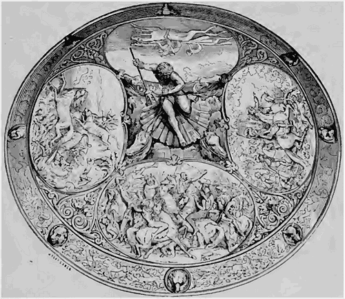 Et d'abord arrêtons-nous devant un magnifique travail exposé par M. Froment-Meurice. C'est un bouclier dont la vue nous a rappelé les descriptions poétiques que font, des boucliers de leurs héros, les vieux poètes du genre humain, Homère et Virgile. Mais, dans ce temps-là, le bouclier était une arme de combat. Aujourd'hui ce n'est plus qu'un prix à suspendre au milieu d'une panoplie; jadis c'était dans le combat corps à corps, au milieu des merveilleux coups d'épée et des puissants coups de lance, qu'il recevait son baptême et sa consécration Maintenant celui à qui il écherra pourrait être le plus timide, le plus faible, le plus petit des mortels, mais il aura eu en sa possession le cheval le plus vile, le jockey le plus maigre et le plus efflanqué; certes, un pareil prix lui sera bien dû pour de telles prouesses. Dans ces combats en champ clos, le champ de bataille est le turf, les combattants des chevaux de l'un et de l'autre sexe, les spectateurs des sportsmen ou gentlemen riders. Le bouclier de M. Froment-Meurice, destiné à servir de prix de course, est une des plus belles pièces de l'orfèvrerie moderne. Il est en fer et en argent. Il se compose d'un sujet central ronde-bosse, de quatre bas-reliefs et d'une frise ou bordure. Le milieu, modelé par M. Jean Feuchères, représente Neptune domptant des chevaux; c'est une idée toute mythologique, vous savez que le bon La Fontaine donne une autre origine à l'appropriation du cheval au service de l'homme. Il s'agissait, vous vous en souvenez, d'une certaine vengeance à tirer d'un cerf. La première idée ennoblit le cheval; la seconde le rapproche beaucoup des petites passions de notre triste humanité. Maintenant, voici le cheval à différentes époques, car son histoire est celle de notre civilisation.