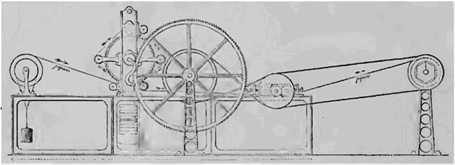 On sait que l'épluchage et le satinage du papier se font à la main et feuille par feuille. M. Callaud-Belisle a essayé de faire faire ce travail à la machine même que nous offrons au lecteur: A est un dévidoir chargé de papier; B sont des cylindres en cuivre destinés à faire tendre le papier et à le guider; C cylindres cannelés en fer, faisant l,200 tours par minute, qui épluchent et satinent; D rouleau servant à lustrer et faisant également 1,200 tours par minute; E cylindres qui abattent le grain du papier; F dévidoir qui reçoit le papier satiné; G engrenages et poulies donnant le mouvement; II soufflet à double vent soufflant sur la feuille du papier et chassant les impuretés. Nous avons consulté des fabricants de papier sur la bonté de cet appareil, et tous, tout en reconnaissant l'avantage qu'il y aurait à faire faire en peu de temps par une machine ce qui demande beaucoup de temps à un grand nombre d'ouvriers, nous ont répondu que le papier ne résisterait pas à un épluchage si vigoureux, qu'il y avait inconvénient à soumettre toute la bande de papier, où souvent il n'y a qu'un grain à enlever, à l'action des cylindres, et que d'ailleurs le papier devait s'user ou même se déchirer. Quant à nous, nous avons fait connaître le mécanisme et les inconvénients qu'on lui reproche; c'est aux fabricants à discuter et à expérimenter.