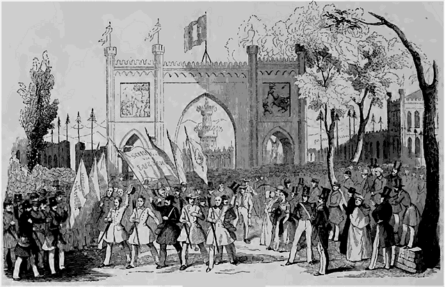 En avant des autorités municipales marchait en outre un géant vivant vêtu du costume national du moyen âge, et tout bardé de fer. Enfin, deux hommes d'une taille et d'une constitution moins extraordinaires, également vêtus du costume suisse du moyen âge, suivaient la musique du bataillon de la landwehr, portant d'énormes gobelets en forme de cornes garnis d'argent.