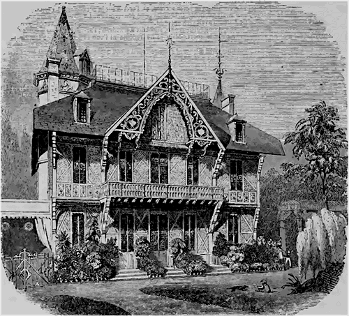 La maison allemande du jardin Beaujon mérite réellement la visite de tous les amateurs. Nous n'avons pas besoin de décrire l'extérieur, dont notre dessin donnera une idée suffisante; quant à l'intérieur, il nous serait difficile de faire comprendre à ceux qui n'ont pas eu comme nous le privilège de l'admirer, combien il est riche, élégant et confortable. Cette maison est une des plus belles et des plus agréables habitations de cette ville nouvelle qui s'étend de la Madeleine à l'Arc-de-Triomphe. Elle contient, dans l'étage du soubassement, une cuisine, un lavoir, une office, un bûcher, un garde-manger, une cave à vin et une grande citerne; au rez-de-chaussée, une antichambre, une salle à manger, une office, un grand salon, un vestibule d'escalier; au premier étage, un vestibule, deux appartements et toutes leurs dépendances; au deuxième étage, un appartement comprenant une salle à manger, un salon, une chambre à coucher, une cuisine et diverses dépendances.