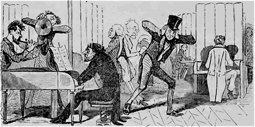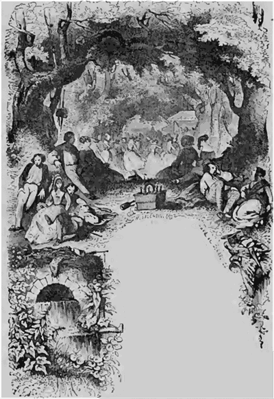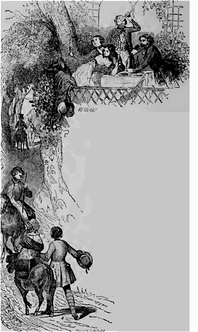 Grâce à la complaisance de M. Kugelmann, nous pouvons aujourd'hui montrer à nos abonnés quelques-uns des dessins qui ornent cet intéressant volume. Faisons avec eux deux petites excursions sur les deux rives de la Seine; allons à Montmorency nous promener à une ou à cheval, boire du champagne et visiter l'Ermitage, cette charmante maison de campagne que la marquise d'Epinay fit construire discrètement pour J.-J. Rousseau pendant un de ses voyages à Genève.--Que si, aux promenades à âne ou à cheval, nous préférons les plaisirs enivrants du bal, courons à Sceaux, où l'on danse sur les ruines de ce beau château construit par Colbert, et dont il ne reste plus qu'un pavillon: là aussi nous retrouverons des souvenirs littéraires. Ce château gothique avec tourelles mâchicoulis, fossés et ponts-levis, qui attire dans la Vallée-aux-Loups l'attention de tous les promeneurs, M. de Chateaubriand l'a fait bâtir à son retour de la Palestine, il y écrivit les Martyrs. Il appartient aujourd'hui à M. Sosthène de La Rochefoucauld...