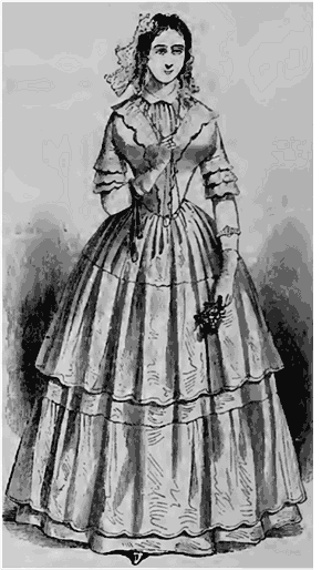 Sur les robes d'organdi à raies ombrées on pose deux volants festonnés ou bordés d'une petite dentelle tournant autour d'une dent arrondie. Le corsage est froncé et à revers dentelé comme les volants; c'est la toilette représentée ici.