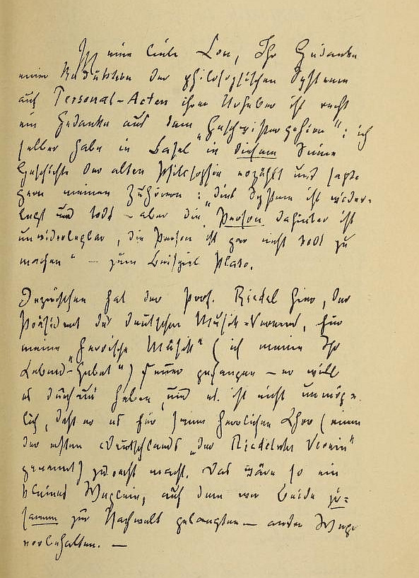 Inzwischen hat der Prof. Riedel hier, der Präsident des deutschen Musik-Vereins, für meine »heroische Musik« (ich meine Ihr »Lebens-Gebet«) Feuer gefangen—er will es durchaus haben, und es ist nicht unmöglich, daß er es für seinen herrlichen Chor (einen der ersten Deutschlands, »der Riedelsche Verein« genannt) zurecht macht. Das wäre so ein kleines Weglein, auf dem wir beide zusammen zur Nachwelt gelangten—andre Wege vorbehalten.—