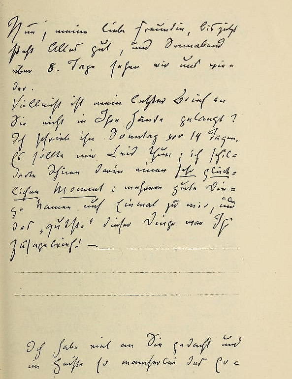 Nun, meine liebe Freundin, bis jetzt steht Alles gut, und Sonnabend über 8 Tage sehen wir uns wieder. Vielleicht ist mein letzter Brief an Sie nicht in Ihre Hände gelangt? Ich schrieb ihn Sonntag vor 14 Tagen.