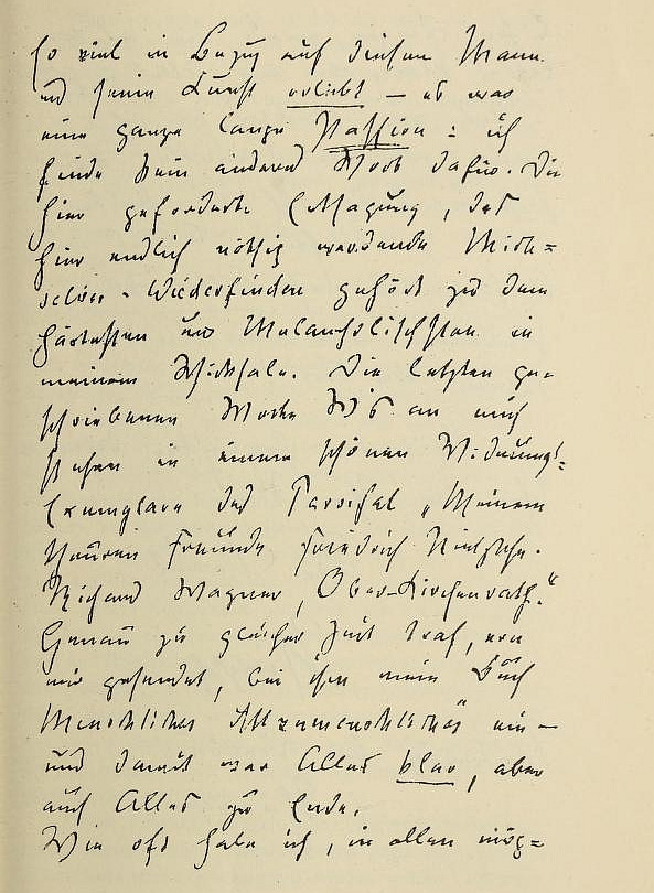 Was Bayreuth betriff, so bin ich zufrieden damit, nicht dort sein zu müssen; und doch, wenn ich ganz geisterhaft in Ihrer Nähe sein könnte, dies und jenes in Ihr Ohr raunend, so sollte mir sogar die Musik zum Parsifal erträglich sein (sonst ist sie mir nicht erträglich.) Ich möchte, daß Sie vorher noch meine kleine Schrift »Richard Wagner in Bayreuth« lesen; Freund Ree besitzt sie wohl. Ich habe so viel in Bezug auf diesen Mann und seine Kunst erlebt—es war eine ganze lange Passion: ich finde kein anderes Wort dafür.
