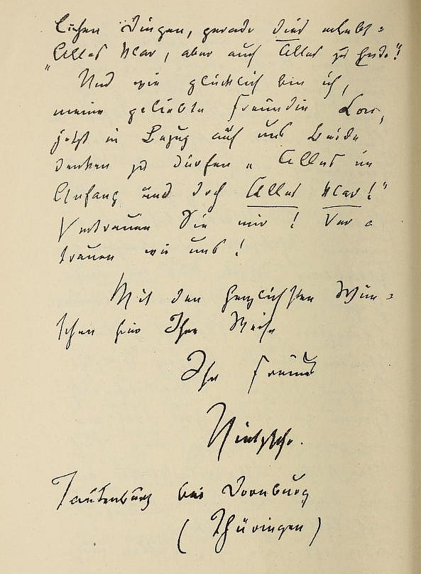Und wie glücklich bin ich, meine geliebte Freundin Lou, jetzt in Bezug auf uns Beide denken zu dürfen »Alles im Anfang und doch Alles klar!« Vertrauen Sie mir! Vertrauen wir uns! Mit den herzlichsten Wünschen für Ihre Reise Ihr Freund Nietzsche.