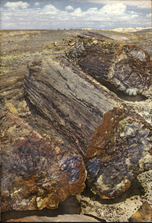 During the latter part of what geologists call the Triassic period, about 160 to 170 million years ago, most of northeastern Arizona was apparently an extensive flood plain; low, flat, and swampy. Numerous streams, some of them quite large, flowed out from the surrounding low hills into the plain. These streams brought enormous quantities of sediments; mud, sand, and other minerals, spreading it out layer upon layer as they shifted their flow back and forth just as on present river deltas. These sediments contained huge amounts of volcanic ash which the streams apparently picked up near their sources. This ash was largely silica, the mineral which was later to be of major importance in the petrification of the wood. (Silica (SiO₂) is the oxide of silicon, a non-metallic element making up 28 per cent of the earth’s crust. The crystal form of silica is quartz, the commonest of all minerals, which is found in large amounts in many volcanic rocks.)