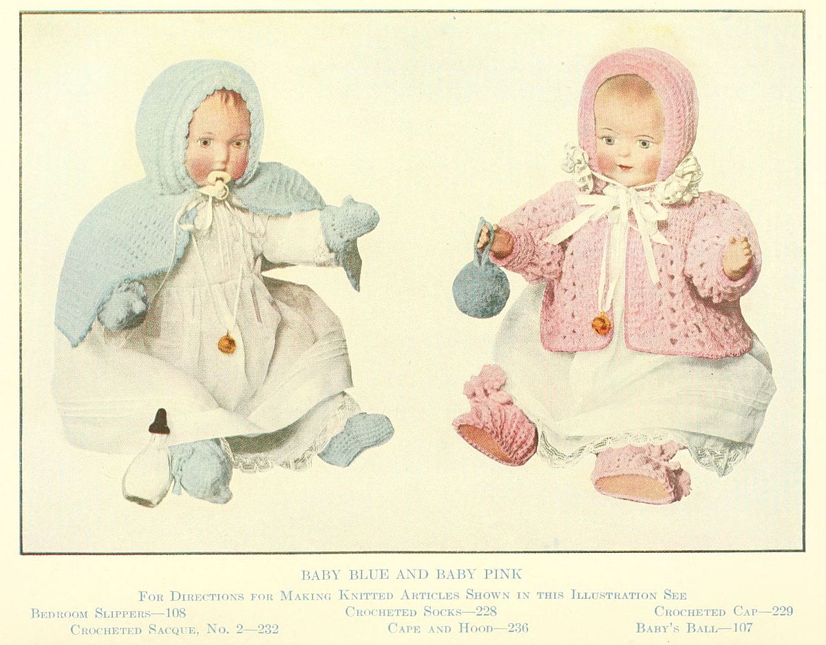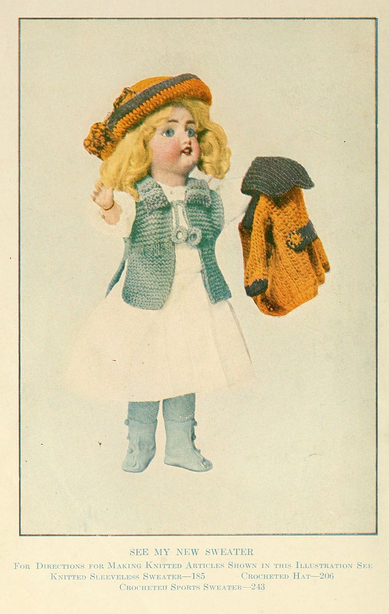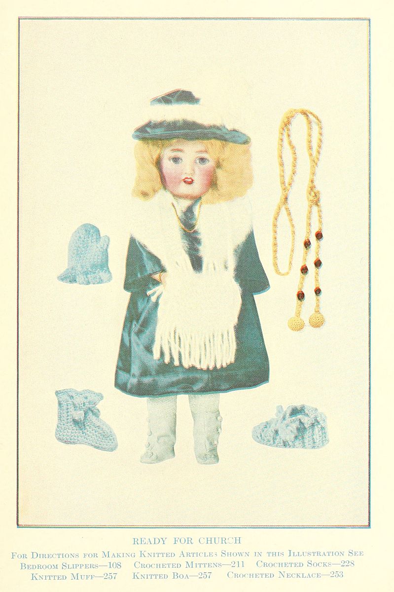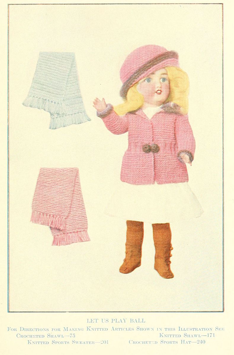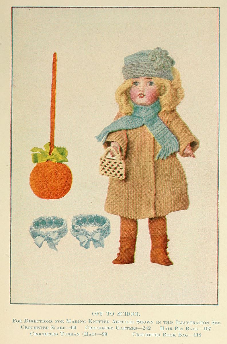 She says, too, that after a girl has learned to crochet and knit for dolls, it is “just as easy as a-b-c” to crochet and knit for real people; and that knitting articles for soldier boys and fathers and mothers makes a person feel of very much account.