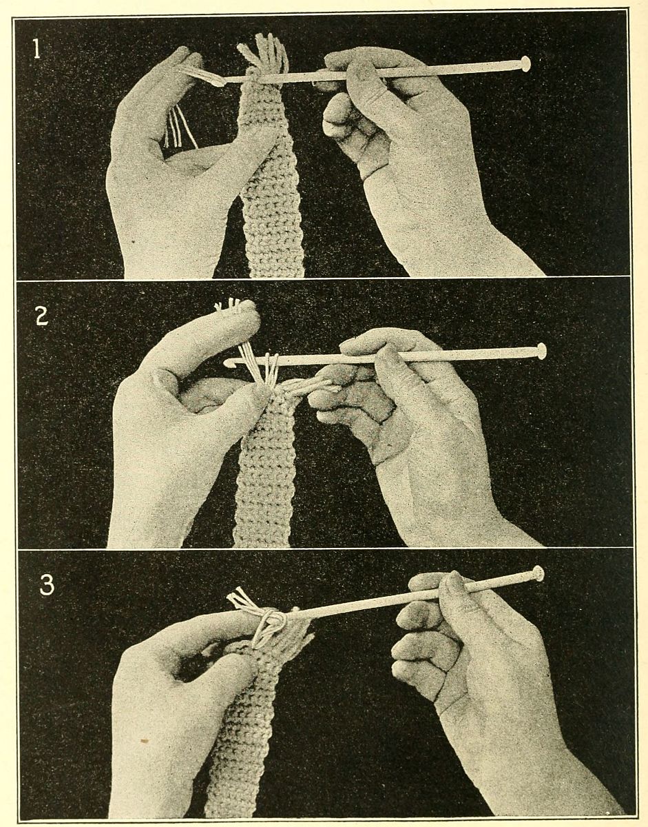 Material: 4 Red Cross needles No. 2, 1 hank yarn (¼ lb.).