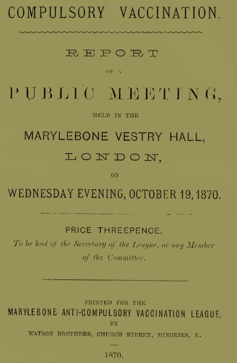On Wednesday Evening, October 19th, 1870, a Public Meeting, convened at the requisition, numerously signed, of the ratepayers of Marylebone, was held in the Vestry Hall of that large Metropolitan Parish. The object of the Meeting, as announced by advertisement, was “to take into consideration the Acts of Parliament which render Vaccination Compulsory.”